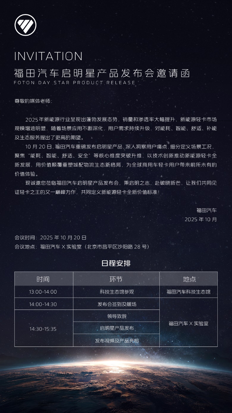 10月20日,福田汽车启明星产品发布会将邀请权威媒体、合作伙伴、战略客户及经销商代表现场见证,福田汽车官方视频号、抖音号也将全程直播。这是福田汽车加速“全面新能源化、全面国际化、全面智能化”的助推器,更是向着 “世界一流商用车企业” 目标全力进发的宣告,诚邀共鉴行业新未来!